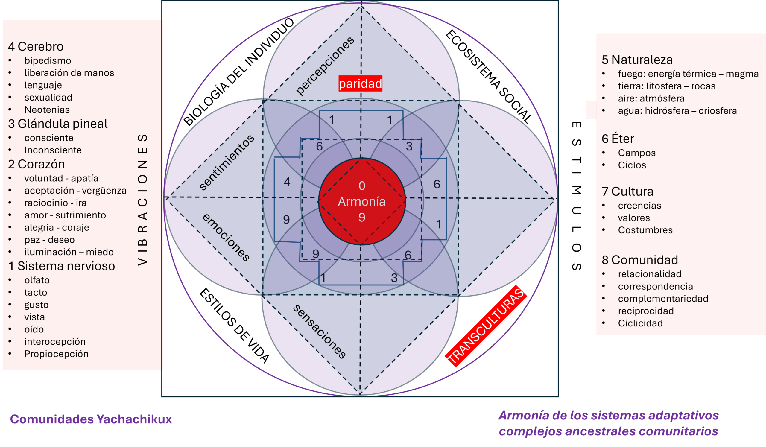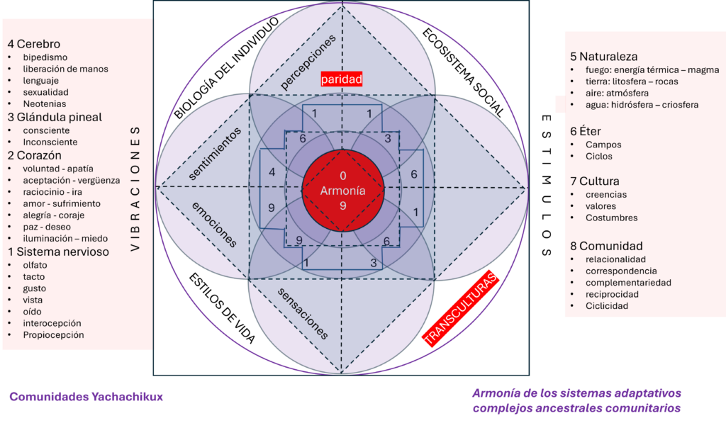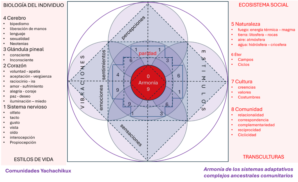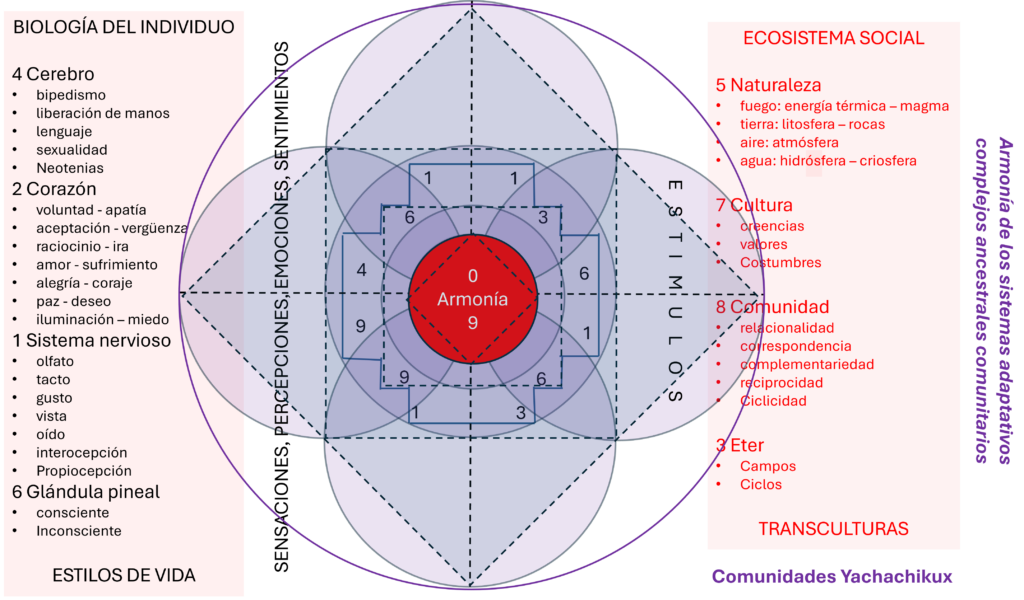 Una parte importante del estudio transcultural es su aplicación en el individuo, afirmamos que los procesos transculturales deben armonizar a las personas, de ahí que se desarrolló un modelo complementario que denota dicho proceso complejo. Lo denominados la armonía de los sistemas adaptativos complejos ancestrales comunitarios y lo utilizamos como recurso para desarrollar talleres de armonía.